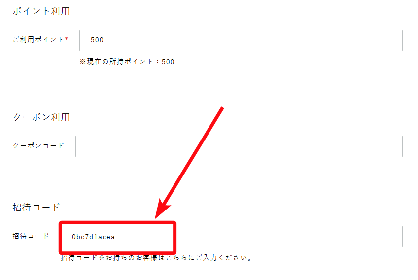 決済画面の紹介コード入力欄にコピー&貼り付けして入力申し込みすると次回使える500円ポイントがマイページに付与されます。