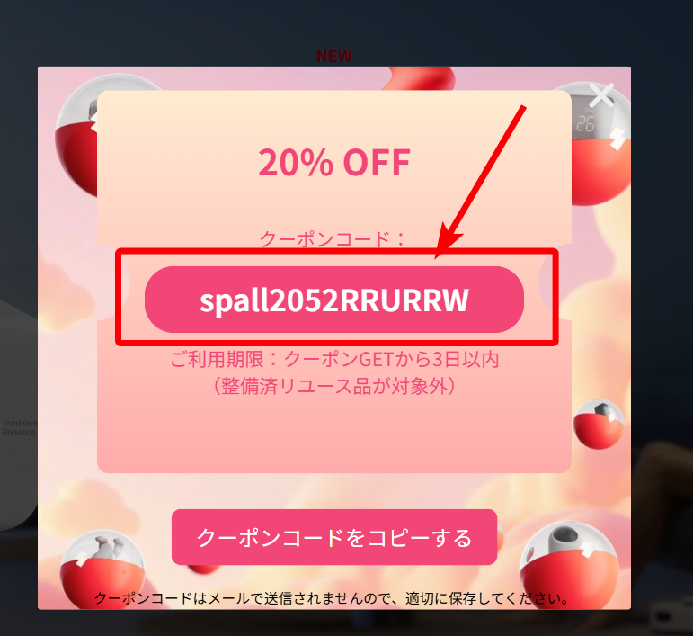 ・こちらは筆者がメルマガ登録&ルーレットでGETしたクーポンコードです