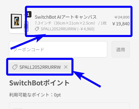 カート→決済画面「クーポンコード」入力→適用→値引き反映を確認