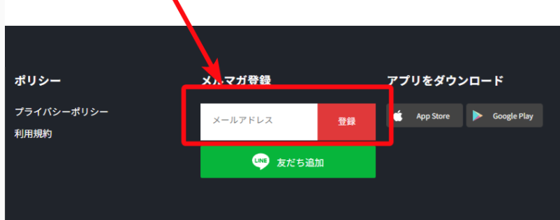 1 公式サイト最下部「メルマガ登録」にメールアドレスを入力して登録をクリック
