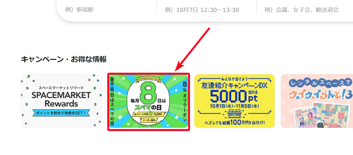- 毎月8日は「スペマの日」で全スペース8%オフクーポン配布(随時開催)