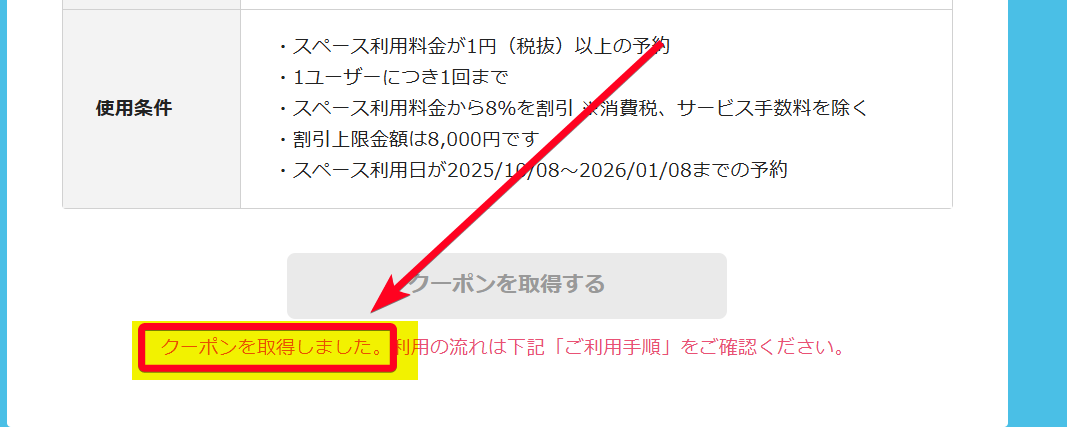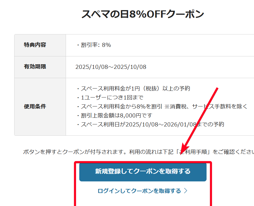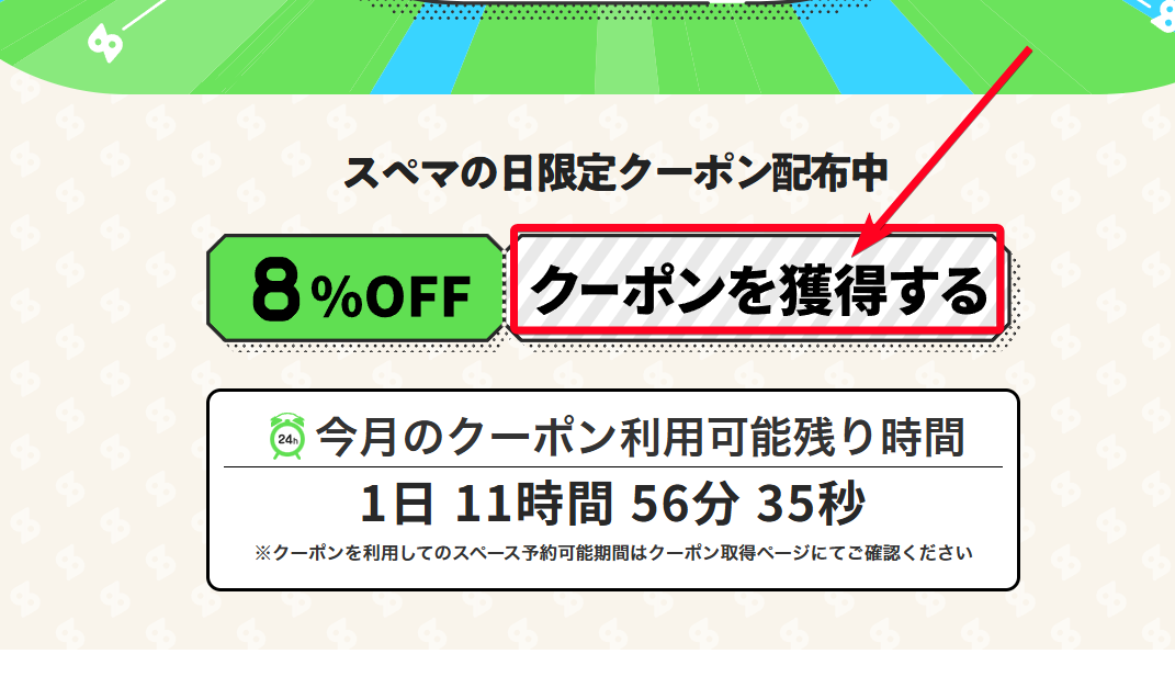 3ヶ月以内のスペース利用に使えるクーポンをGETできるのは毎月8日のみ!