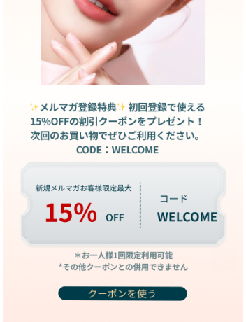 例)メルマガ15%OFFーポンコード:WELCOME▼