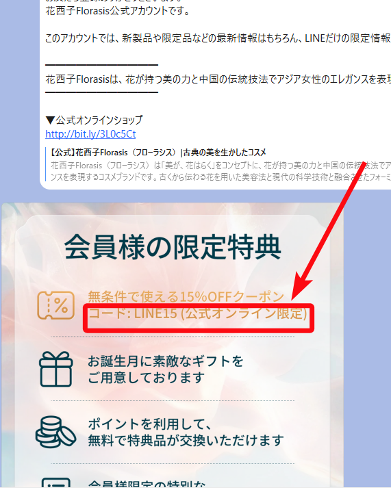 花西子(フローラシス)の公式LINEお友だち登録をすると、すぐにトーク画面にクーポンコードを取得可能です。