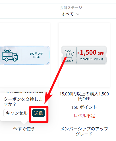 マイページ>「オンライン交換」>「送料無料(500円OFF)」の今すぐ使うをクリック