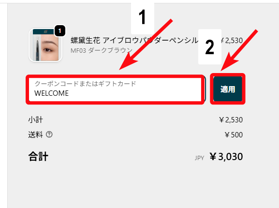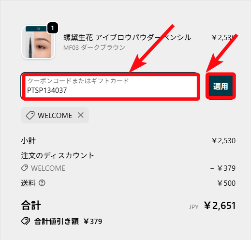 2.クーポンコード入力欄に、15%OFFクーポンコードをコピーして貼り付け入力します