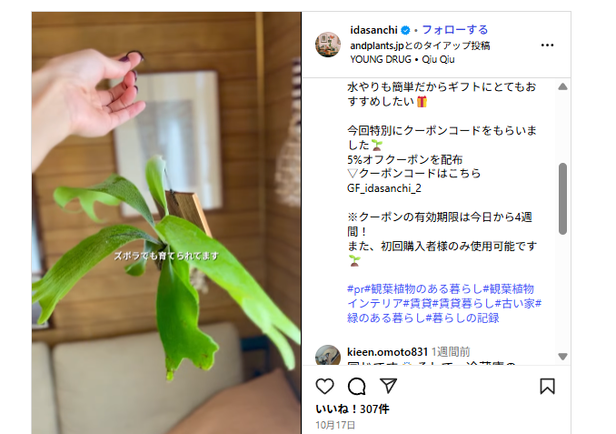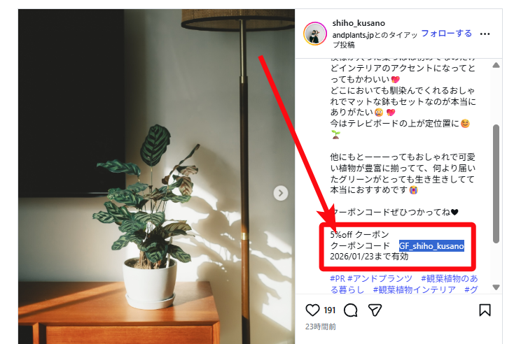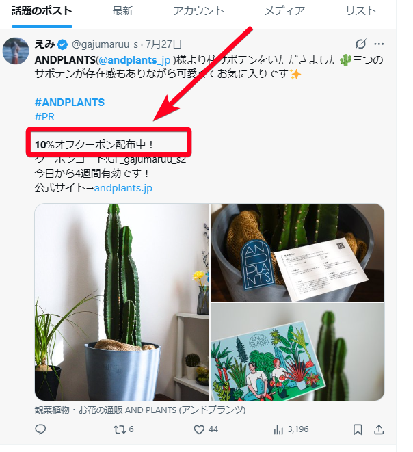 アンドプランツ(AND PLANTS)では10%OFFクーポン【友だち紹介コード】が一部のSNS(X・Instagram)投稿者から発行されることがあります。