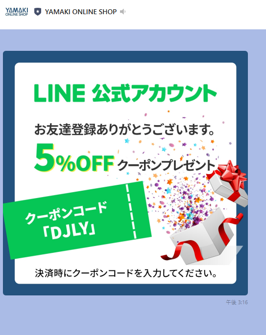 LINEおともだち登録時にもらえるクーポンコードです。