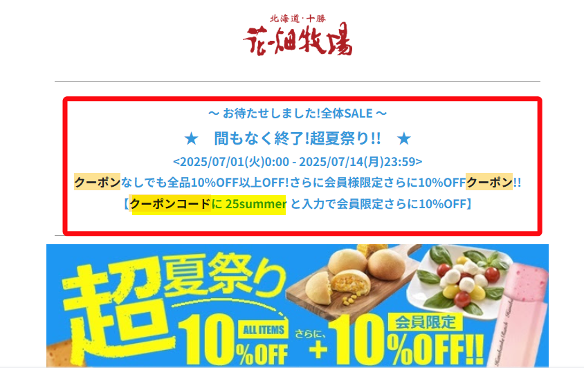 花畑牧場の「クーポンコード」は、現在メルマガ限定で年に1〜2回しか発行されません(2025年は7月の1回のみ)。LINEでも配布は行われていません。