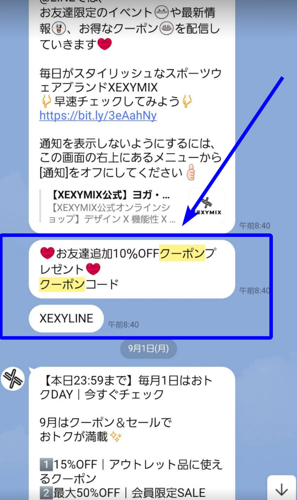 2.トーク画面に友だち追加10%OFFクーポンコードが発行され即座に利用可能です。