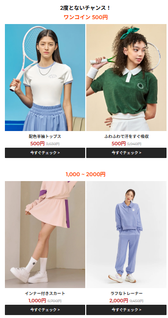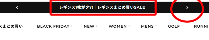 ページ最上部の黒いお知らせバーにも開催中のセールやクーポンが流れます。スライドでチェック!