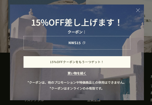 3.その場で15%OFFクーポンコードが画面に表示されます