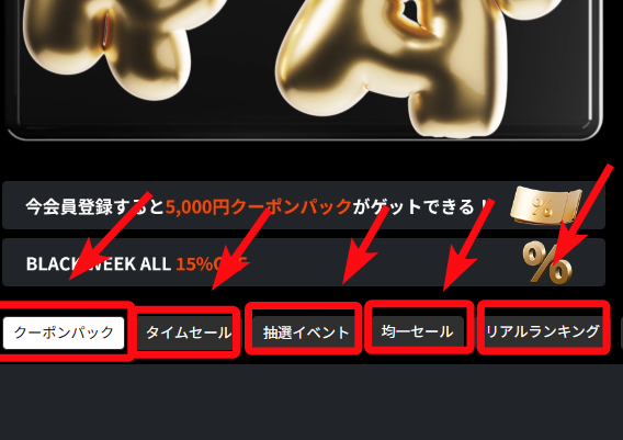 セール会場のメニュー項目をクリックしてお得なクーポンやセールへ入場できます▼