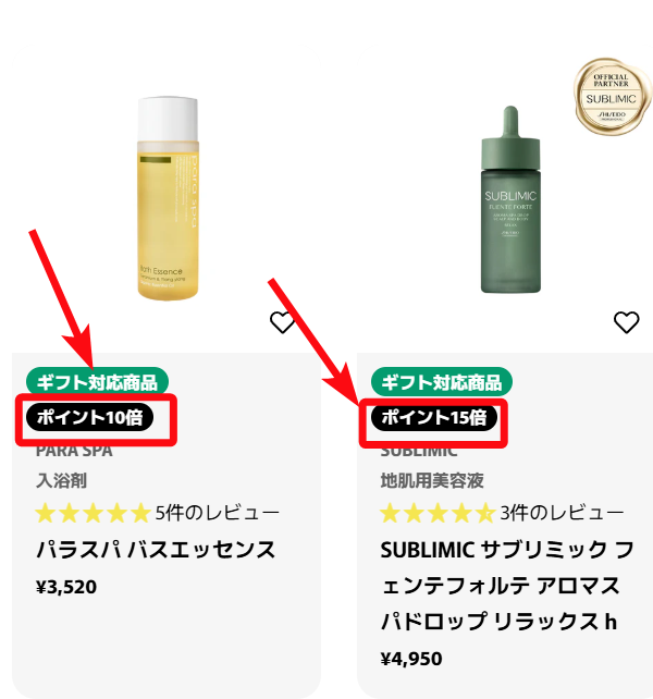 一部の商品に「ポイント10倍」や「ポイント15倍」など記載があるので注意して見てみましょう。