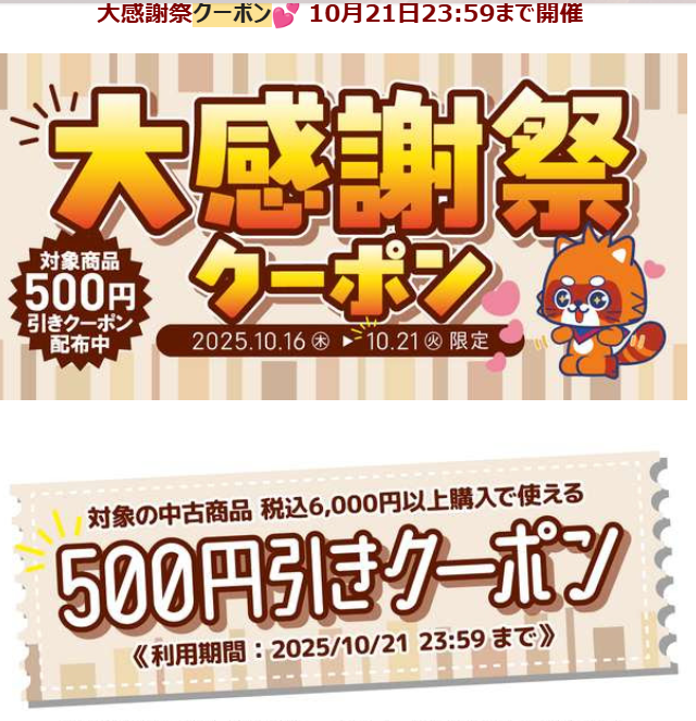 | オープン2周年記念セール | 2024年11月1日〜11月4日 | 2周年記念の限定セール。中古商品にクーポン適用。 |