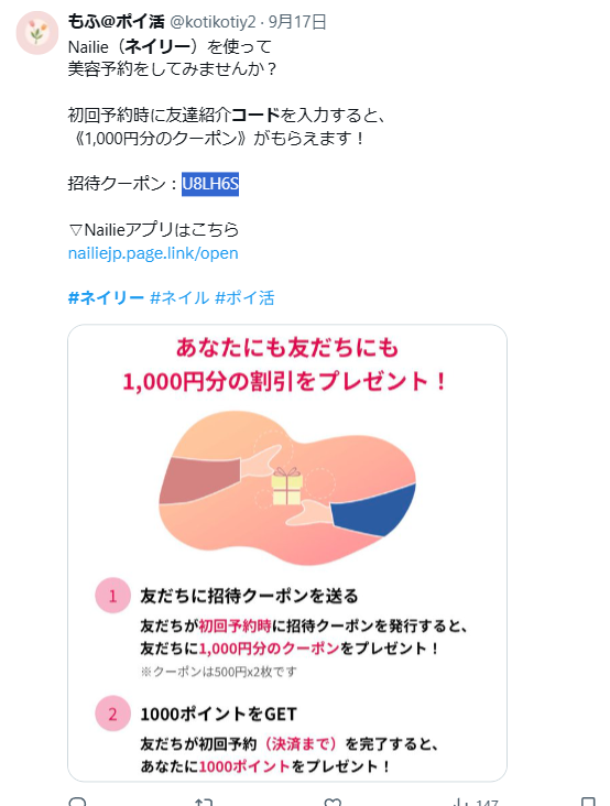 X(旧ツイッター)などで招待コードを紹介してポイントをGETしましょう!
