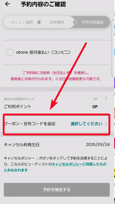 2.取得したクーポンコードをコピーして、ネイリーアプリ内の予約確認画面で「クーポンコードを追加」よりコードを入力すると適用されます。