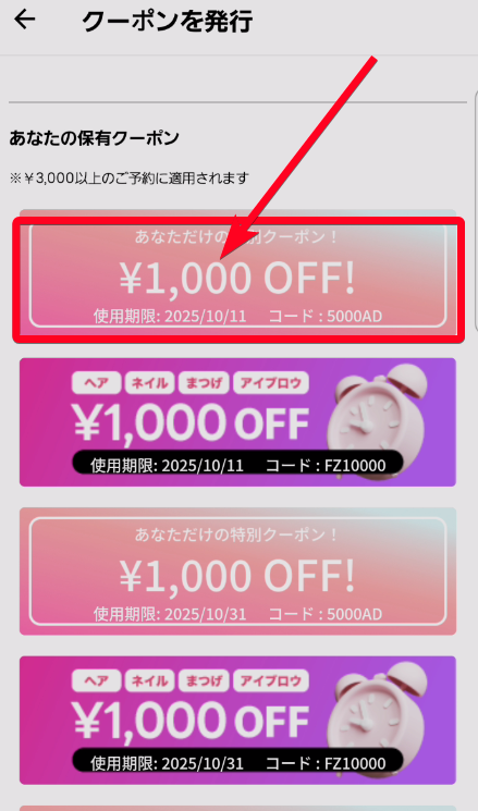 3.クーポンコードが登録されて画面下部に表示されるので適用したいものを選択