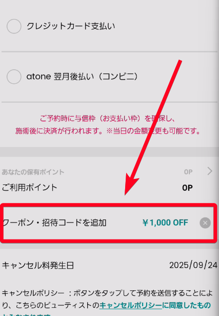 4.クーポン1000円OFFが適用担ったことを確認して決済を完了して下さい