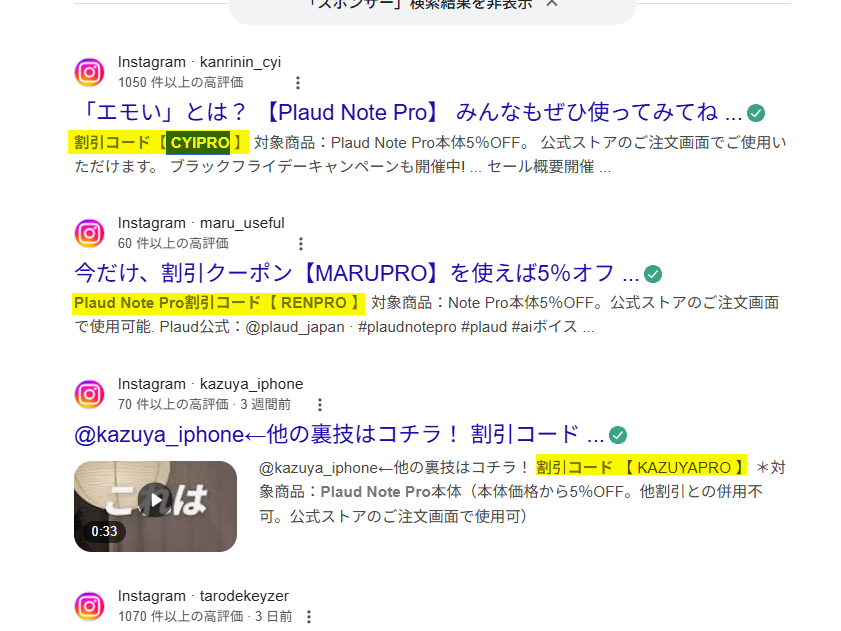 YouTubeで一部インフルエンサーがPlaud Note Proの「5%OFFクーポンコード」を投稿しています。