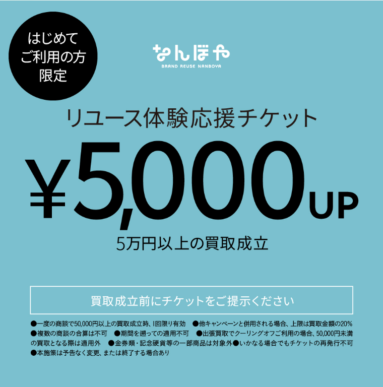 過去になんぼや系列(ブランド コンシェル、古美術 八光堂など)を利用したことがない方が対象です。1人1回限り、確実にもらえる権利なので、初めての方は絶対に忘れないでくださいね。