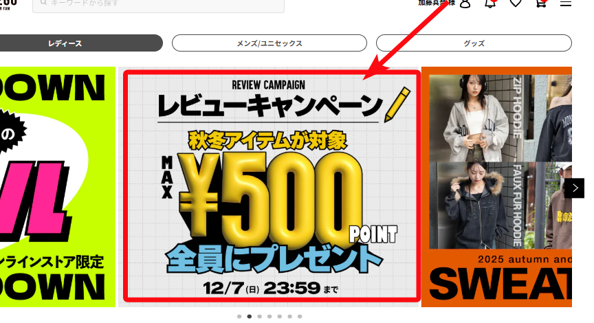 WEGO公式通販サイトでは、不定期にレビューで全員に500円ポイントをプレゼントする