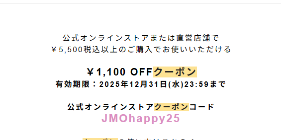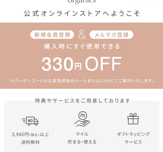 ジョンマスターオーガニック公式サイトで新規会員登録とメルマガ登録をすると初回から使える330円OFFクーポンコードを取得できます。