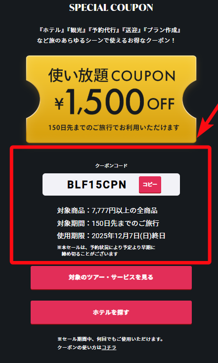 バナーをクリックして画面を下へスクロールしていくとクーポンコードが掲載されています。