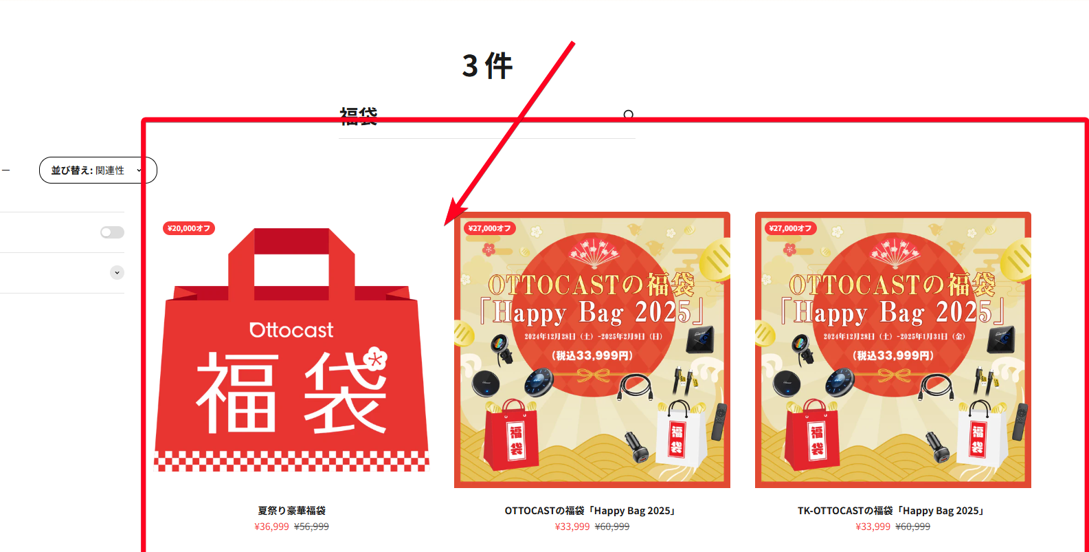 2025年9月26日現在ottocast(オットキャスト)の福袋は公式サイトには通常掲載されておらず、検索しないと見つからないようになっています。