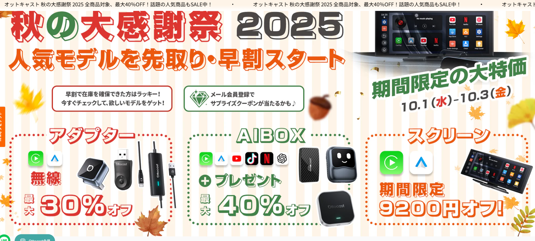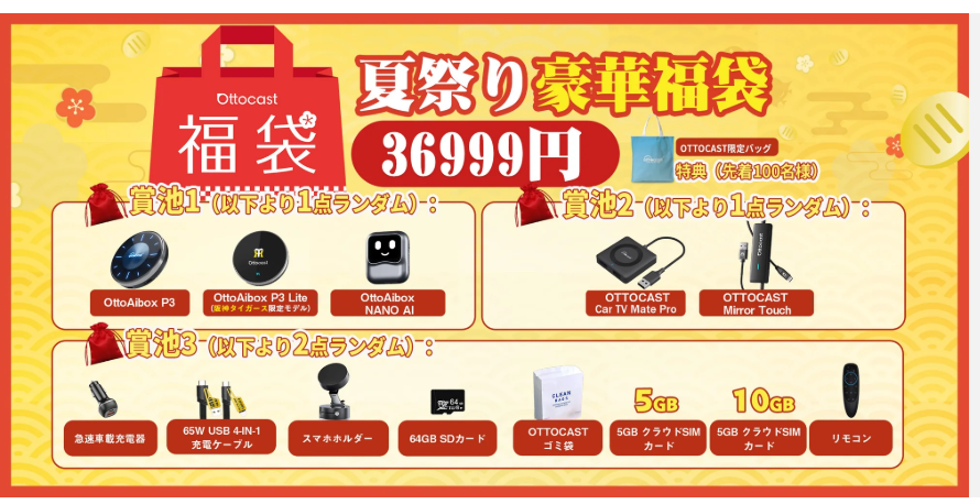 今年の夏は、カーライフをもっと快適にするOTTOCASTの特別セールが開催中!人気デバイスやアクセサリーが入った「夏祭り豪華福袋」は、最大¥20,000 OFFで手に入る超お得なチャンスです。