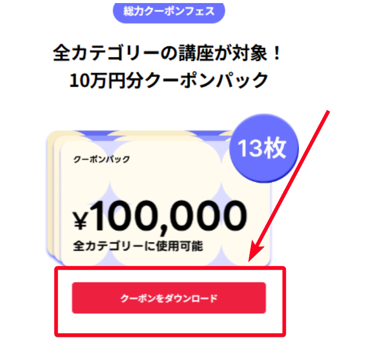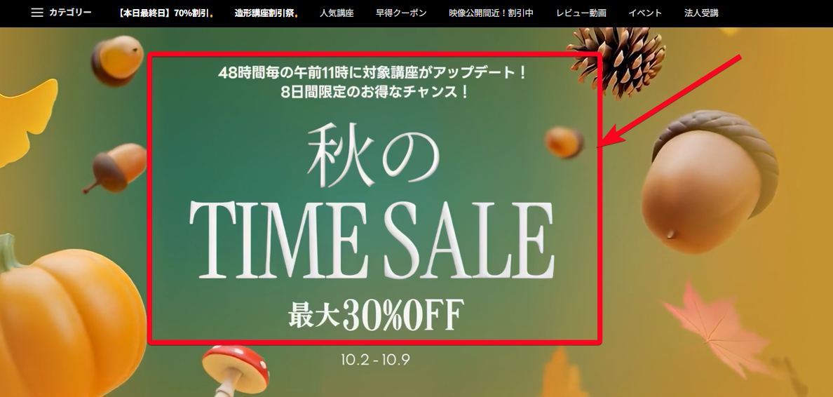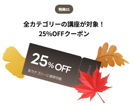このイベントでは、最大90%OFFの超特価講座や半額クーポンが発行されることがあります。