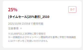 上記のカテゴリー別クーポンコードが、自分の受講したい講座に適用できるかチェックしましょう