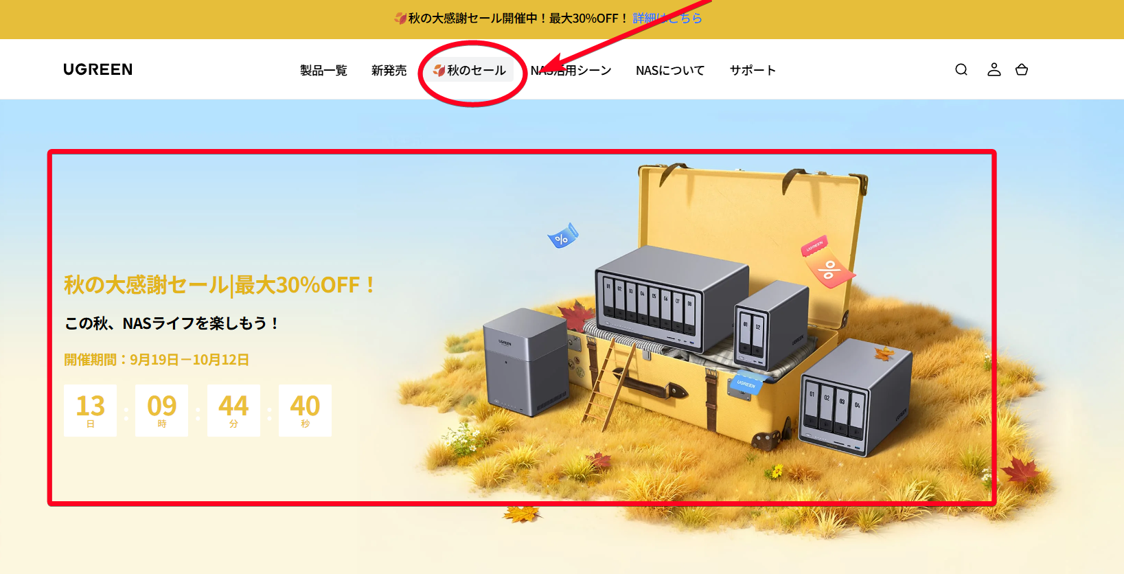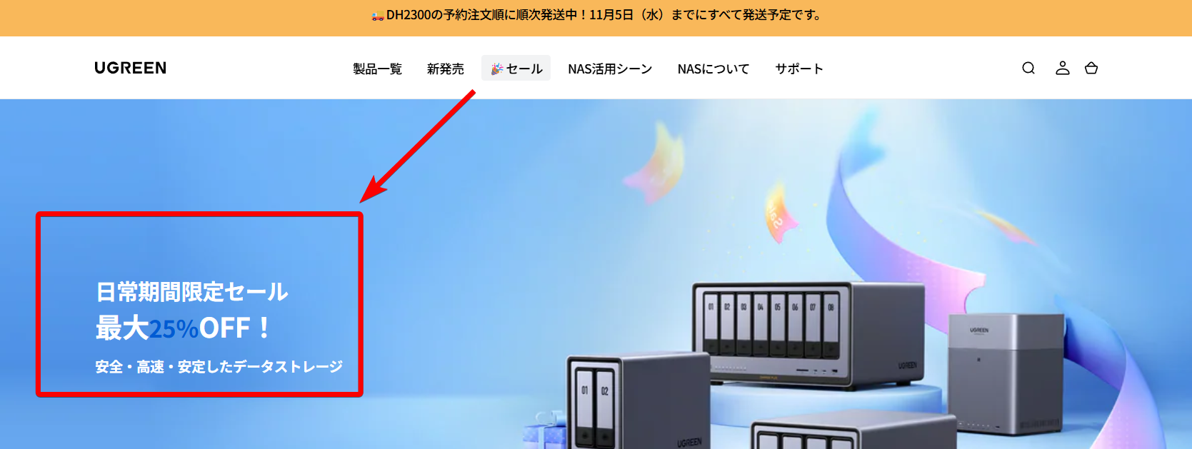 公式サイトのセール情報はUGREEN公式サイトTOPページ上部の「セール会場」をクリックすると確認できます。
