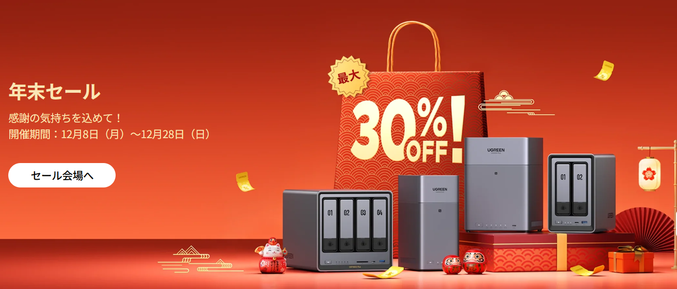 UGREEN NAS公式サイト(nas.ugreen.jp)で12/28までの年末セールが開催中です。