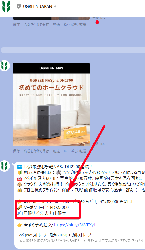 【公式ショップ限定】でメルマガ登録しておくとゲリラクーポンやセール情報が届くことがあります。クーポンコード:UGNAS2000など