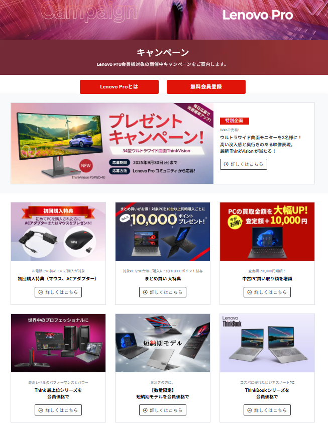 こちらがご要望のLenovo Pro会員様対象の開催中キャンペーン一覧です。