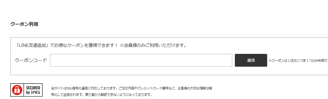 LINE登録なしでも利用できますが今後お得な情報が入手できるので登録しましょう。クーポン利用方法商品をカートに入れ決済画面のクーポンコード入力欄でクーポンコードをコピーアンドペーストして適用をしてください