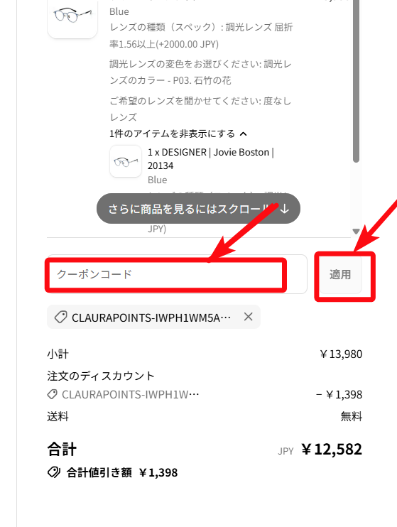 例: 9,980円フレーム1本+「CLAURA4YOU」10%OFF=8,982円→無料!2本目狙いで確実クリア。