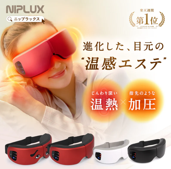 NIPLUXのホット系アイマスクは、温熱+加圧+(SはBluetooth音楽)で“寝落ちレベルのリラックス”を求める人向けです。