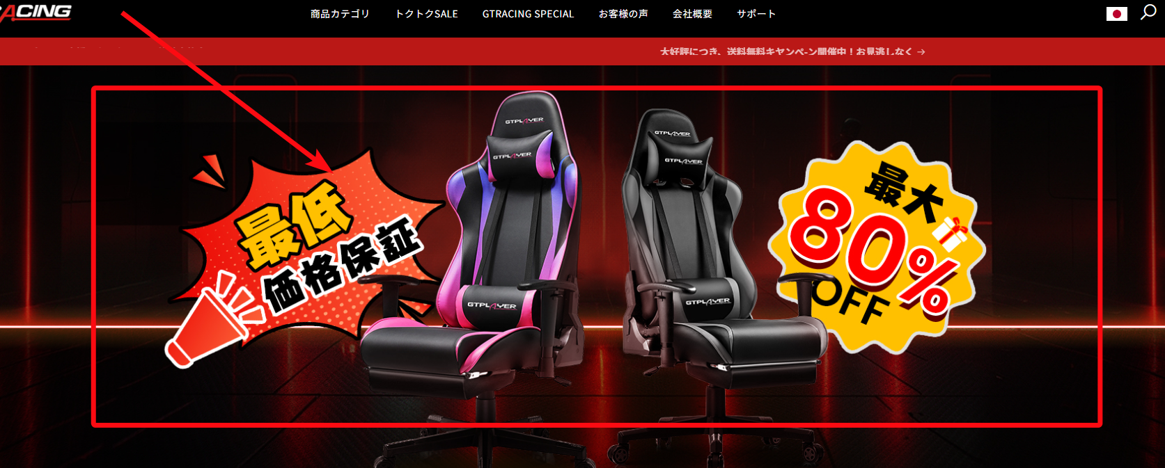 【ジーティーレーシング公式サイト】のトップページ上部バナーで最新セールを確認することができます。