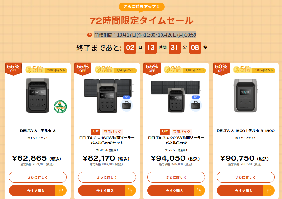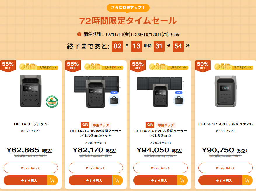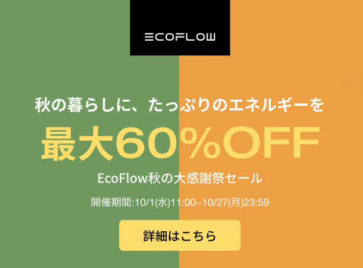 EcoFlow公式通販の秋の感謝祭セールでは、お得に購入できるクーポンや豪華特典が満載です。ポイントやプレゼントを活用して最大限お得にゲットしましょう!