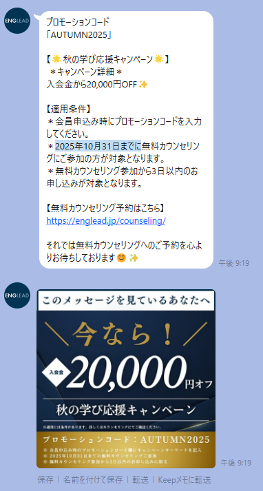 入会金20,000円割引 | 他キャンペーンと併用不可 | 無料カウンセリング後3日以内申込 |