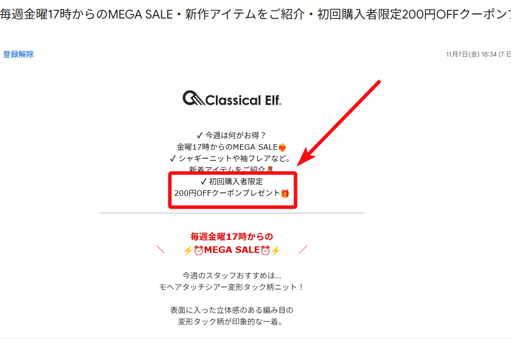 - キャンペーンやクーポンの通知は毎週金曜日18:30頃メルマガで届きます