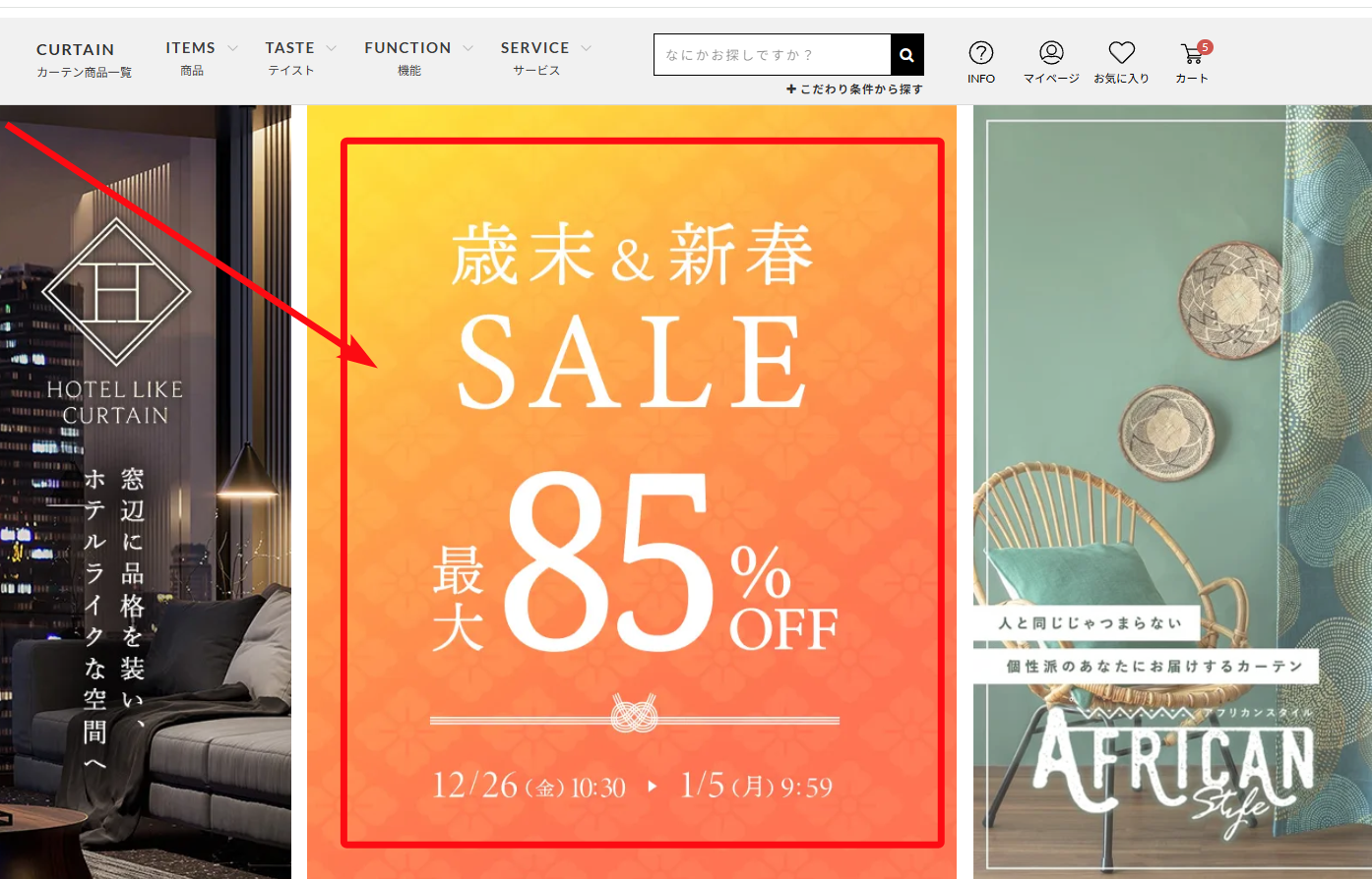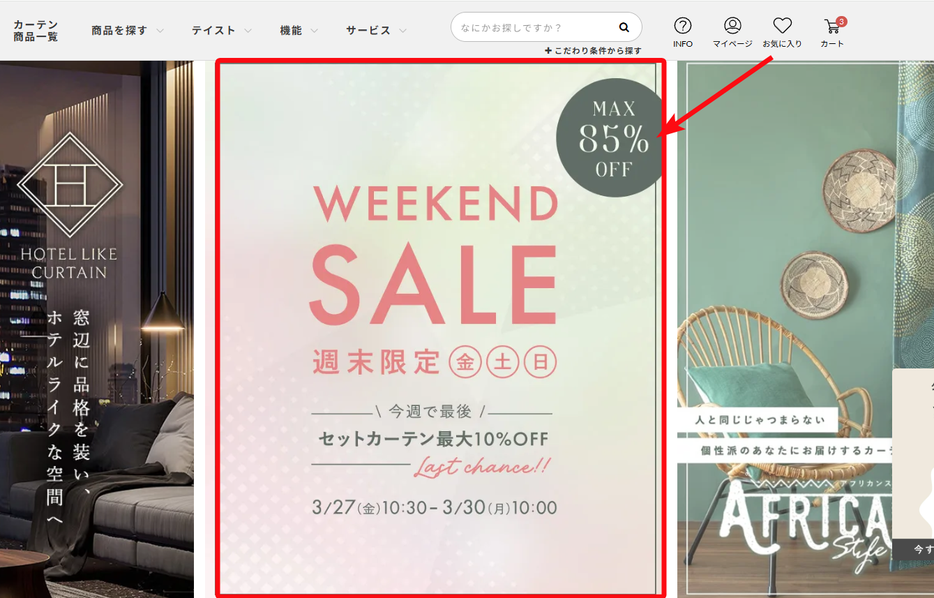 | 新作入荷時 | 新作カーテン10%OFFセール。 | トレンド商品をお得に先取り可能。 |