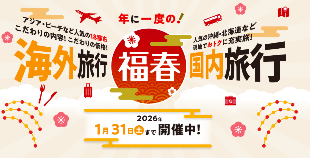 【福春2026】国内・海外クーポン&最大30万円福引(12/16~1/6予約)