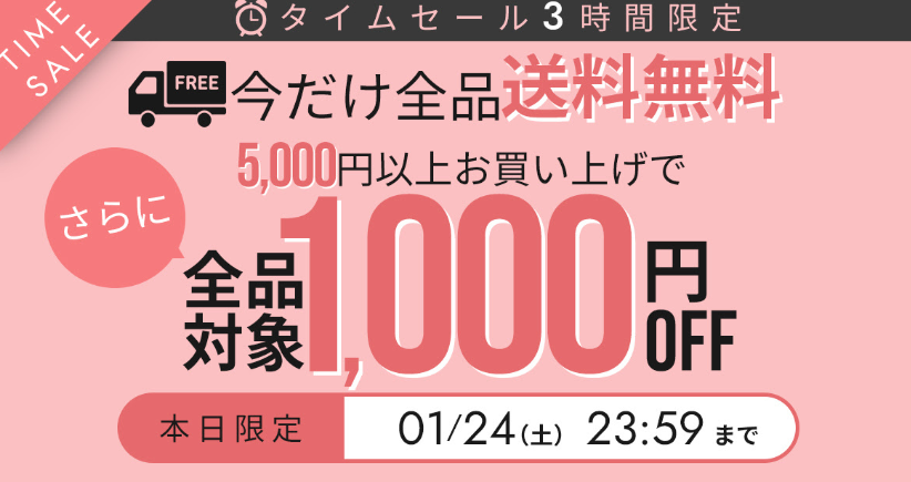 例:最大1,000円OFFクーポン、全品ポイント5倍、最大61%OFFセールなど。