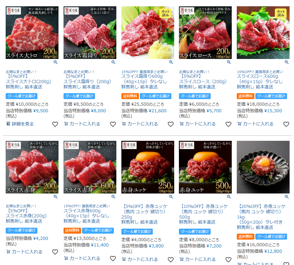 菅野屋の単品まとめ買いページから、在庫ありの最安商品を割引率優先で厳選。熊本直送の鮮馬刺しが5-20%OFFで狙い目。送料無料品も多く、業務用600g以上がおトクを実感。