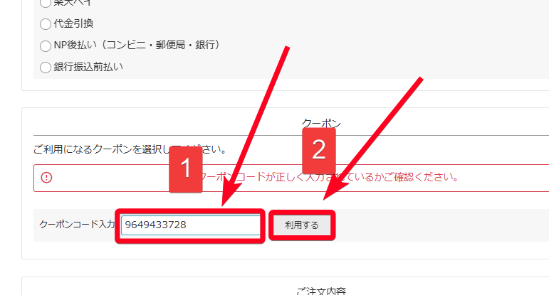 2.クーポンコード入力欄にクーポンコードをコピー&貼り付け入力して「利用する」をクリックしてください。割引が適用されます。