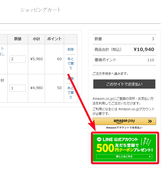 ポイントは、決済画面で「利用可能な全ポイントを利用する」を選択すると、500円OFFになります。