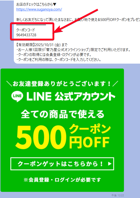 2.LINE友だち登録するとトーク画面にクーポンコードが即座に表示されます。